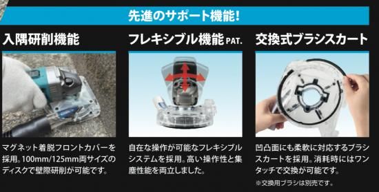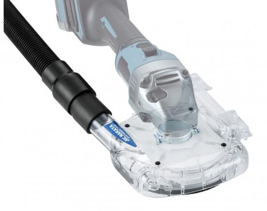 各メーカーのグラインダや各種研削ディスクに対応したユニバーサルデザイン、自由度の高い作業を可能とするフレキシブル機構、入隅研削(壁際研削)機能など、使いやすさにも徹底的にこだわった、集塵カバーの新しいスタンダードです。