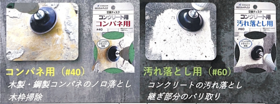 汚れ落とし用(#60)はコンクリート表面の汚れ落とし、継ぎ部分のバリ取りに便利です。