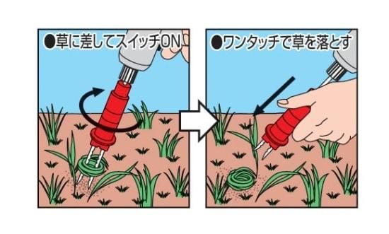 ●充電式ドリルドライバーに取り付け、回転させるだけで雑草を根から抜き取り、楽に草取りができます。